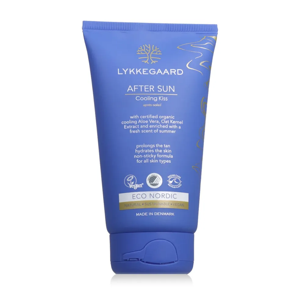 Lykkegaard After Sun Cooling Kiss Gel – Beruhigendes After Sun Gel (150 ml) ist ein erfrischendes und regenerierendes After Sun Gel, das gereizte Haut sofort beruhigt, Spannungsgefühle lindert und eine schnellere Erholung nach dem Sonnenbad fördert. Es enthält eine Kombination aus Aloe Vera, Gurkenextrakt und anderen natürlichen feuchtigkeitsspendenden Wirkstoffen, die der Haut Erleichterung und einen angenehmen Kühleffekt verleihen.