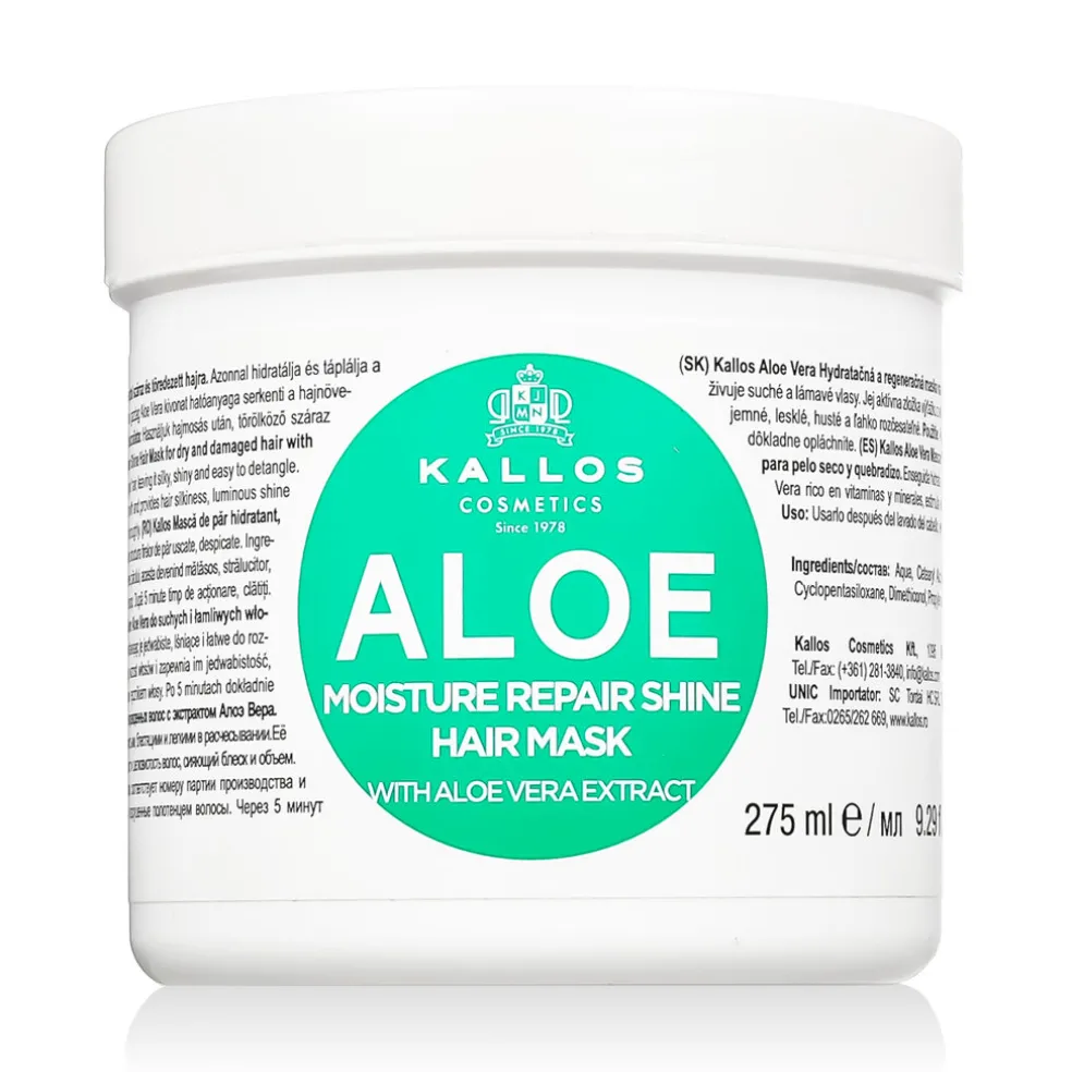 Kallos Cosmetics Aloe Vera Kallos Moisture Repair Shine Hair Mask – feuchtigkeitsspendende und nährende Maske für trockenes Haar bringt intensive Pflege für müdes und dehydriertes Haar. Dank des Gehalts an Aloe Vera, die für ihre beruhigende und feuchtigkeitsspendende Wirkung bekannt ist, spendet die Maske tiefenwirksame Nährstoffe, erhöht den Glanz und macht das Haar weich und leicht kämmbar. Sie ist die ideale Wahl für durch Sonne, häufiges Färben oder Wärmebehandlungen strapaziertes Haar.