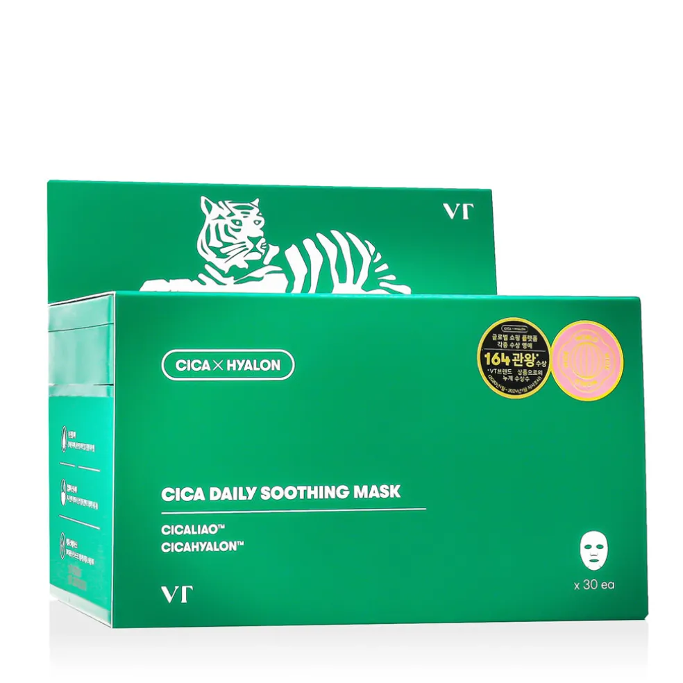 VT Cosmetics Cica Daily Soothing Mask – 30 Stück sind beruhigende Blattmasken, die intensive Feuchtigkeit und Regeneration der gereizten Haut bieten. Sie enthalten den CICA-Komplex mit asiatischem Nabel-Extrakt, der entzündungshemmende und antibakterielle Eigenschaften hat und hilft, Rötungen und Irritationen zu reduzieren.