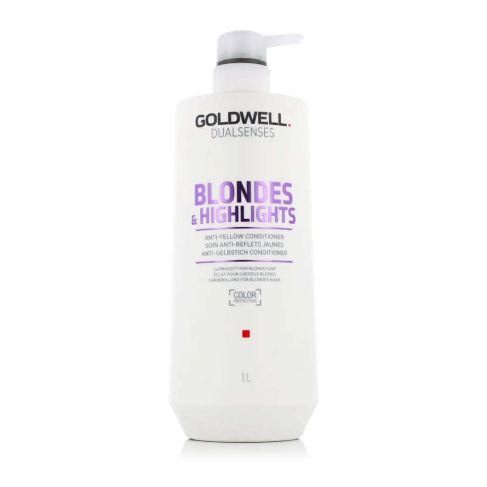 Goldwell Dualsenses Blondes & Highlights Anti-Yellow Conditioner 1000 ml ist ein professioneller Conditioner für die Pflege von blondem Haar und Haar mit Strähnchen, der unerwünschte Gelbtöne neutralisiert. Dank seiner Formel hilft er, kühle Haartöne zu erhalten, während er das Haar intensiv mit Feuchtigkeit und Nährstoffen versorgt und es weich, glänzend und leicht kämmbar macht.