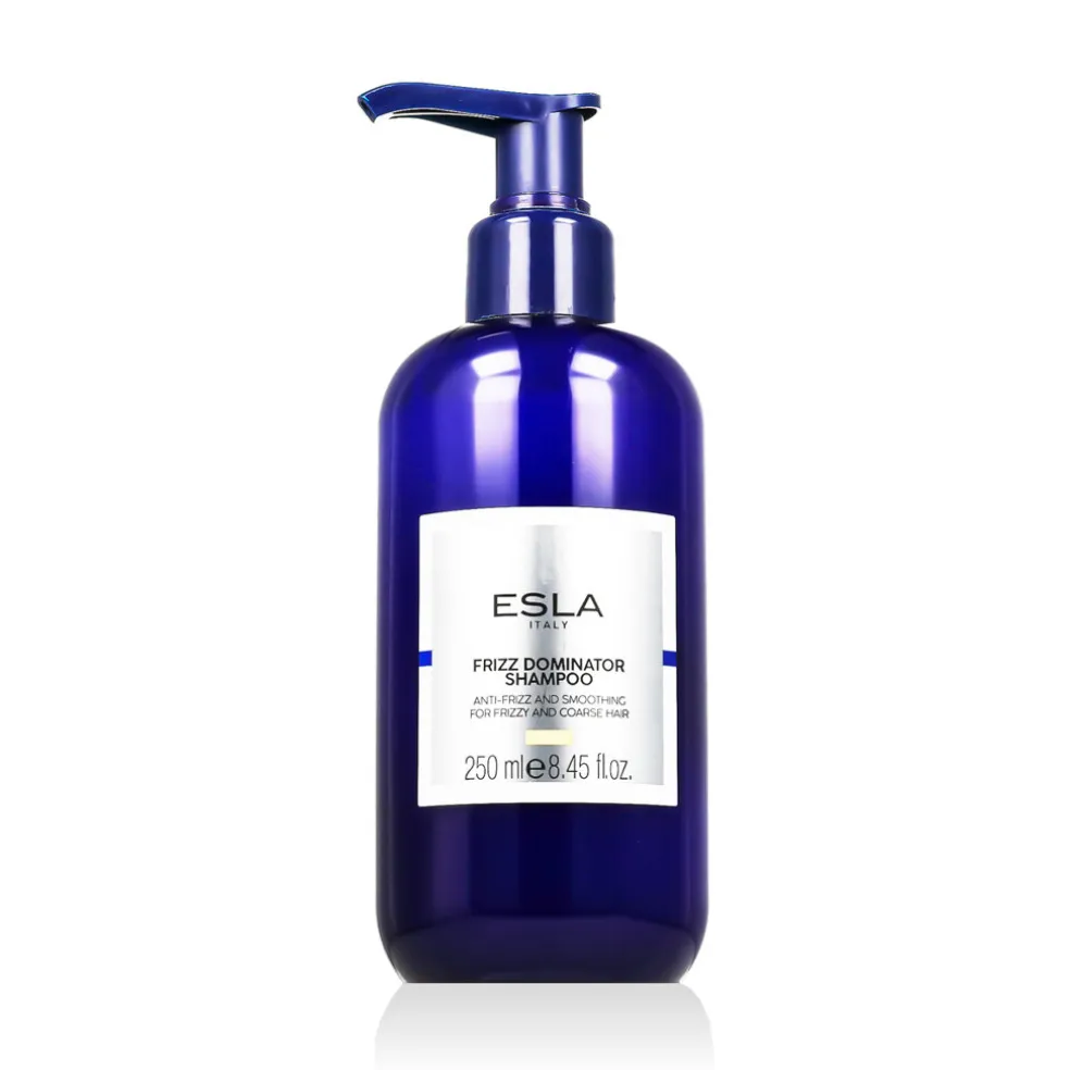 ESLA Italy Frizz Dominator Shampoo – Shampoo für widerspenstiges und krauses Haar spendet intensive Feuchtigkeit und Glanz, während es die Haarstruktur verbessert und vor Feuchtigkeit schützt. Es ist mit pflanzlichem Phytokeratin aus Hanf und Reis angereichert, das durch bioenzymatische Behandlung gewonnen wird und dank seiner filmbildenden Eigenschaften das Haar umhüllt, es stärkt und hilft, Frizz zu verhindern.