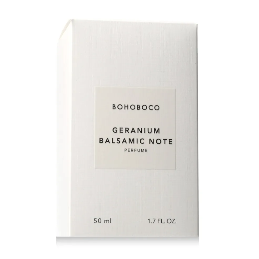 Geranium Balsamic Note ist ein Parfüm aus dem Jahr 2016, das Bohoboco als Unisex-Duft eingeführt hat, der holzige und orientalische Akkorde mit aromatischen grünen Untertönen kombiniert. Der Duft eröffnet mit frischen und krautigen Noten – trockene, leicht würzige Wacholderbeeren verbinden sich mit einem kräftigen und leicht bitteren Lorbeerblatt, das dem Parfüm einen rustikalen Charakter verleiht und an einen Spaziergang in einem mediterranen Garten erinnert.