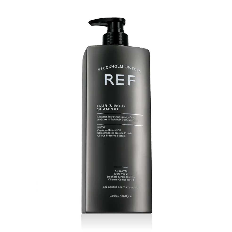 REF Hair & Body Shampoo 1000 ml ist ein Mehrzweck-Shampoo und Duschgel, das Haare und Körper sanft reinigt und gleichzeitig erfrischend und feuchtigkeitsspendend wirkt. Dank seines Gehalts an Pflanzenextrakten und Proteinen hilft es, die Haarstruktur zu stärken, während es die Haut mit Feuchtigkeit versorgt und revitalisiert. Die praktische Formel ist ideal für die tägliche Anwendung und für alle Haar- und Hauttypen geeignet.