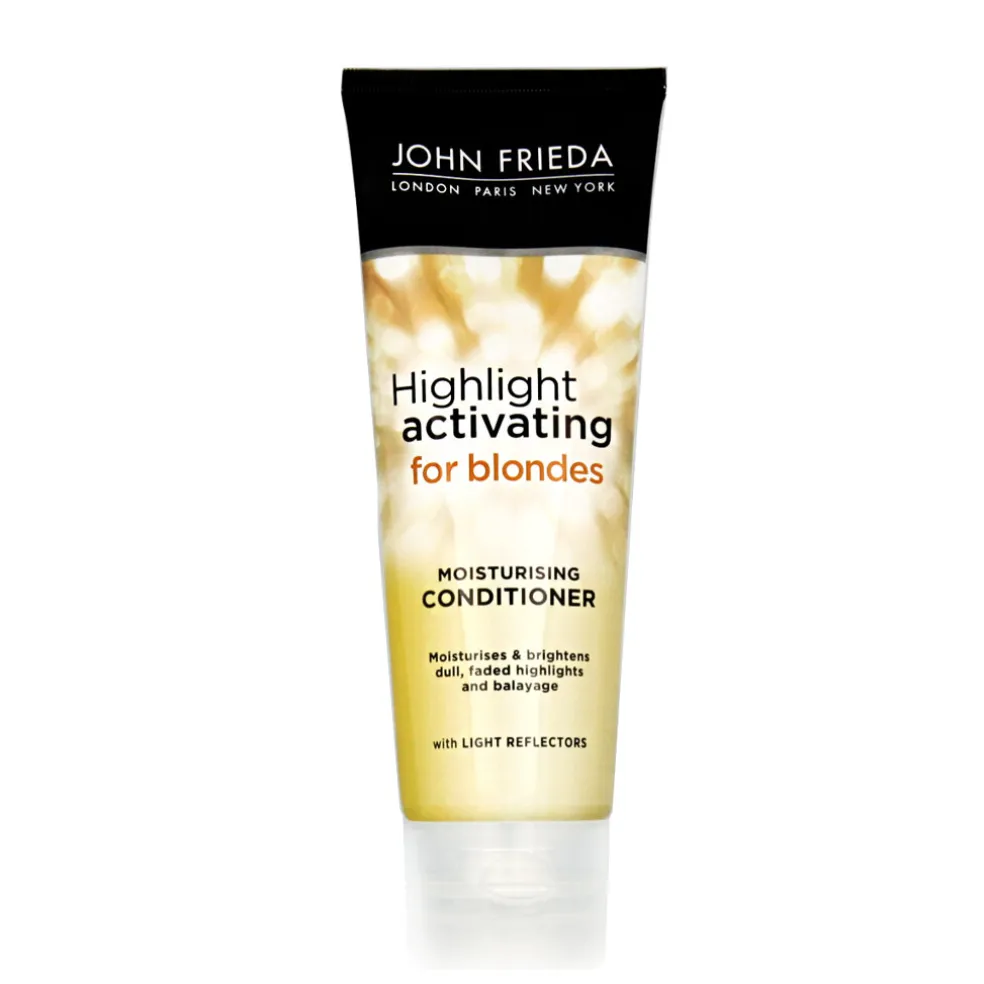 John Frieda Highlight Activating Moisturizing Conditioner 250 ml – eine nährende Pflegespülung für blondes Haar, die intensive Feuchtigkeit spendet und hilft, die Helligkeit und den Farbton von Blondtönen zu bewahren.
