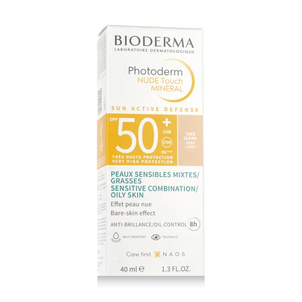 Bioderma Photoderm Nude Touch Mineral SPF 50+ PA++++ – Getöntes Fluid mit Sonnenschutz (40 ml) ist ein leichtes mineralisches Fluid für Mischhaut bis fettige Haut, die zu Überempfindlichkeit gegenüber chemischen Filtern neigt. Es bietet dank rein mineralischer Filter einen sehr hohen Schutz vor UVA- und UVB-Strahlen, vereinheitlicht den Hautton und kontrolliert den Glanz dank der einzigartigen Liquid-to-Powder-Technologie, die die flüssige Textur in Sekundenschnelle in ein samtig-mattes Finish verwandelt. Es verstopft die Poren nicht und beschwert die Haut nicht, so dass es für den täglichen Gebrauch geeignet ist.