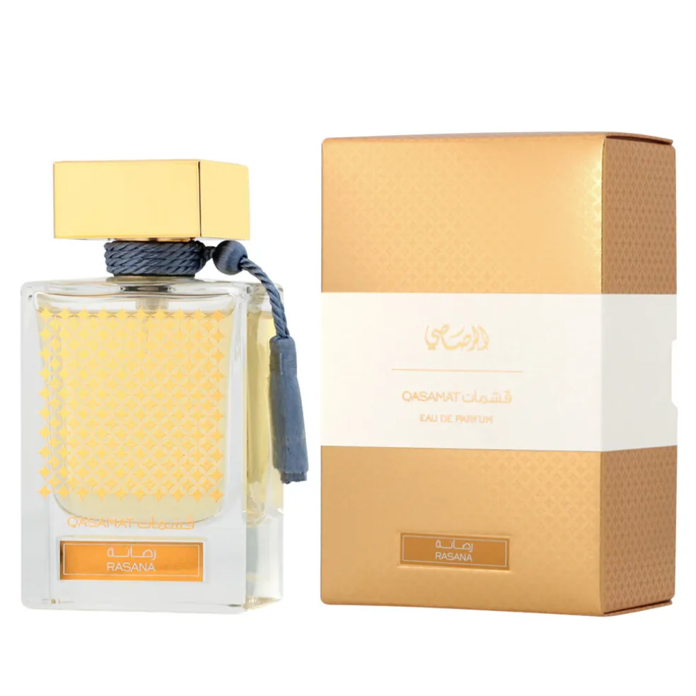 Qasmat Rasana ist ein eleganter, moderner orientalischer Duft, der für ein bereicherndes sensorisches Erlebnis sorgt. Der Duft eröffnet mit frischen, fruchtigen Noten von Zitrone, Apfel und Bergamotte. In der Herznote vereinen sich Leder, Sandelholz und Zypriol mit einer orientalischen Basisnote aus reichhaltigem Moschus, Amber, Zedernholz und Agarholz – Oud.