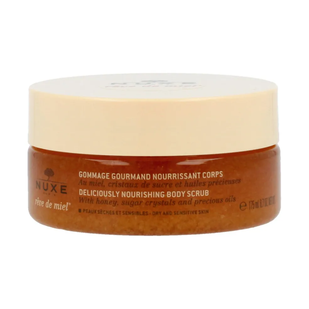 Nuxe Rêve de Miel Deliciously Nourishing Body Scrub 175 ml ist ein reichhaltiges Körperpeeling, das sanft abgestorbene Hautzellen entfernt und die Haut gleichzeitig nährt, weich macht und beruhigt. Es enthält eine Kombination aus Zuckerkristallen, Honig und pflanzlichen Ölen (Sonnenblumen-, Argan- und Borretschöl) und ist daher ideal für trockene und empfindliche Haut.