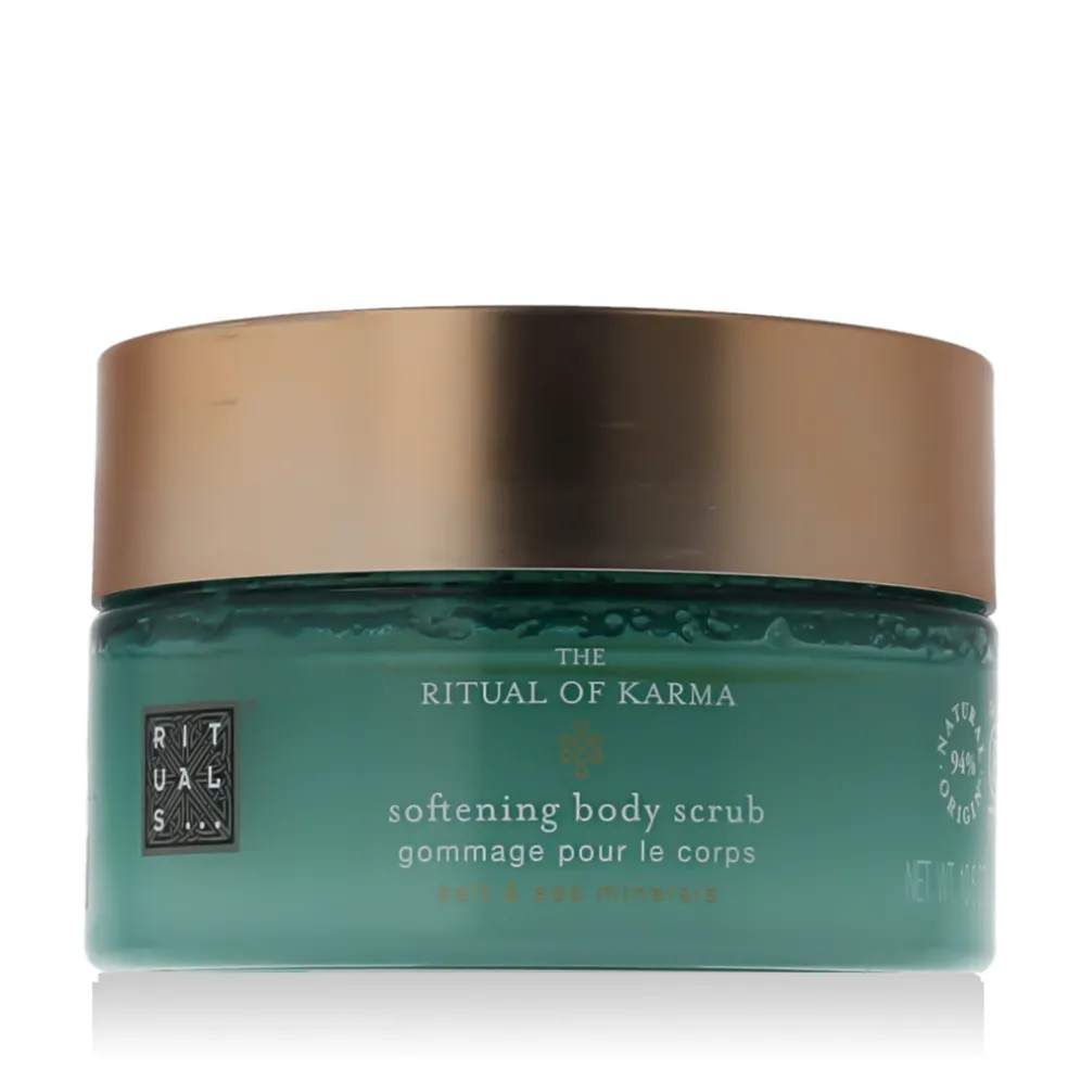Rituals The Ritual of Karma Body Scrub 300 g ist ein luxuriöses Körperpeeling, das sanft abgestorbene Hautzellen entfernt, während seine feuchtigkeitsspendende Formel mit Ölen und Meersalz die Haut glatt, genährt und strahlend macht. Mit heiligem Lotus und weißem Tee sorgt es für ein Gefühl von Sommerfrische und Harmonie.