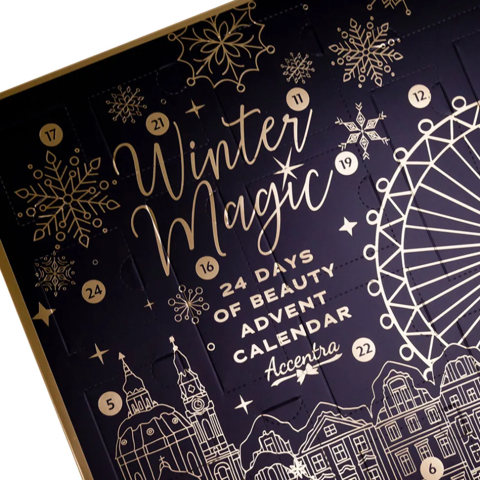 Der Accentra Winter Magic Noir Adventskalender ist ein luxuriöser Adventskalender in einer quadratischen Schachtel mit 24 eleganten Überraschungen für Pflege und Komfort im Winter. Jedes Fenster enthält pflegende Produkte wie feuchtigkeitsspendende Körperlotion, milde Seife, Körperpeeling, Hand- und Nagelcreme, reinigendes Shampoo, Badebomben oder Badesalze. Der Kalender enthält außerdem praktische Accessoires wie einen Bimsstein, eine Nagelbürste, eine Nagelfeile und einen Waschschwamm zur Vervollständigung des täglichen Rituals. Abgerundet wird das Ganze mit einer Duftkerze und Badeschaum für die ultimative Entspannung. Der Winter Magic Noir Adventskalender ist das perfekte Geschenk für alle, die jeden Wintertag mit einem Hauch von Eleganz und Pflege genießen möchten.