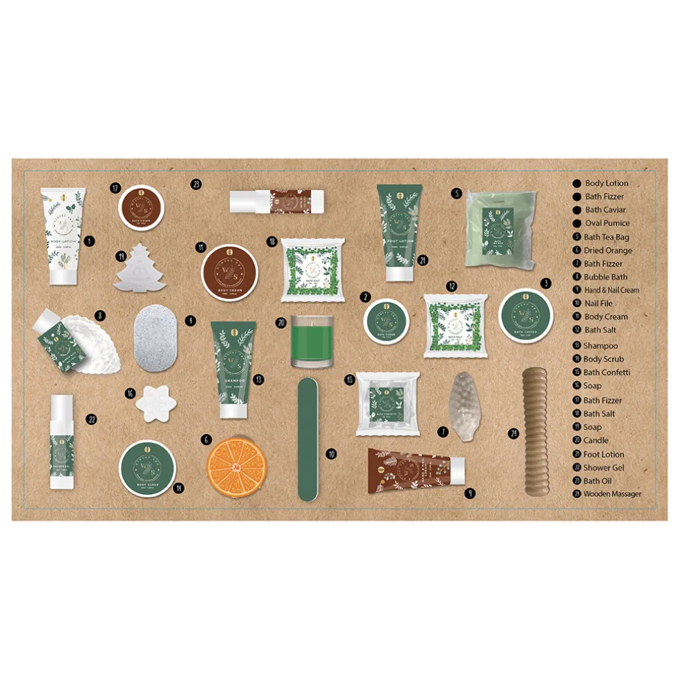 Accentra Winter Spa Fresh Pine & Winter Berries Bath & Body Advent Calendar ist ein Winterpflege-Adventskalender, inspiriert vom Duft frischer Kiefern und Winterbeeren. Dieser Kalender mit aufklappbarer Vorderseite bietet 24 Überraschungen, die jeden Tag der Adventszeit zu einem kleinen Wellness-Ritual machen. Sie finden verwöhnende Produkte wie Körperlotion, Badeschaum, Shampoo, Hand- und Nagelcreme, Körperpeeling, Kerzen und sogar einen hölzernen Massageroller, der Ihnen hilft, sich zu entspannen und zu erholen. Weitere zauberhafte Überraschungen sind Badezusätze, Badesalze, Badekaviar und getrocknete Orangen, die jedem Bad eine einzigartige Note verleihen. Der Winter Spa Adventskalender ist das perfekte Geschenk für alle, die Momente der Gemütlichkeit und den Duft des Winterwaldes lieben.