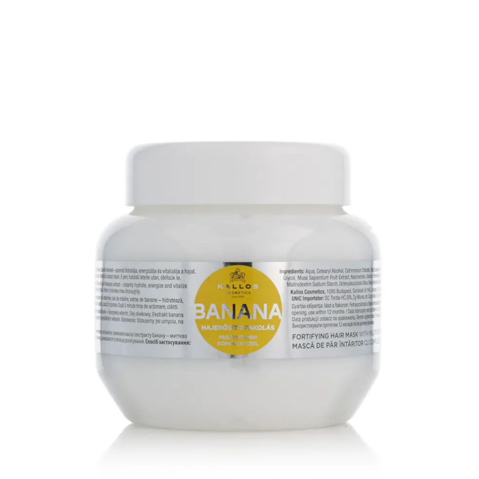 DieKallos Banana With Multivitamin Complex Hair Mask 275 ml ist eine nährende Haarmaske mit Bananenextrakt und Multivitamin-Komplex, die für trockenes, kraftloses und geschädigtes Haar entwickelt wurde. Dank des Gehalts an den Vitaminen A, B, C und E sowie Bananenextrakt und Olivenöl sorgt die Maske für eine intensive Regeneration, fördert die Erneuerung der Haarfaser und macht das Haar glatt, geschmeidig und mit einem gesunden Glanz. Sie ist für die regelmäßige Anwendung geeignet und bietet ideale Pflege mit einem herrlich fruchtigen Duft.