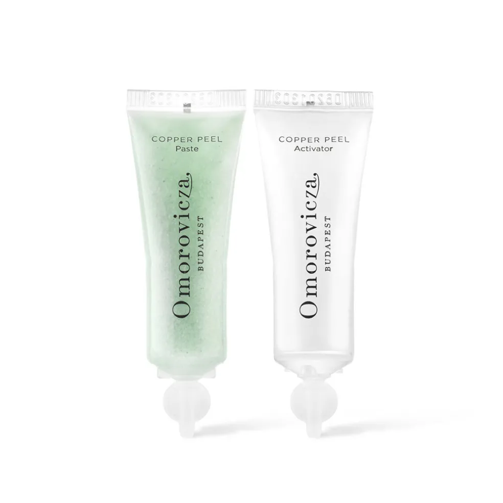 Im ersten Schritt die Copper Peel Paste auf das gesamte Gesicht von der Stirn bis zum Hals auftragen. Vermeiden Sie dabei den Kontakt mit den Augen und Lippen. Tragen Sie dann in einem zweiten Schritt den Copper Peel Activator auf die Copper Peel Paste auf. Massieren Sie den entstandenen weißen Schaum zwei Minuten lang sanft in kreisenden Bewegungen ein. Gründlich ausspülen.