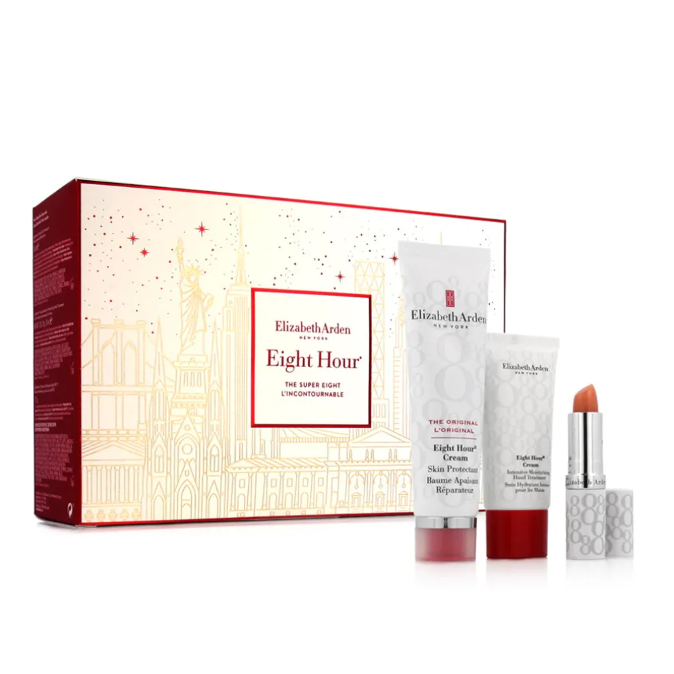 DasElizabeth Arden Eight Hour Cream Nourishing Skin Essentials Kit ist ein Geschenkset mit kultigen Produkten aus der Eight Hour Cream Reihe, die Haut, Lippen und Körper intensiv mit Feuchtigkeit versorgen, nähren und schützen. Dieses Set ist ideal für die umfassende Pflege trockener und feuchtigkeitsarmer Haut, ob zu Hause oder unterwegs.