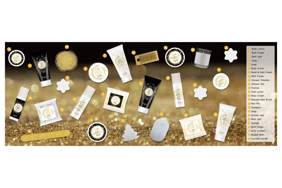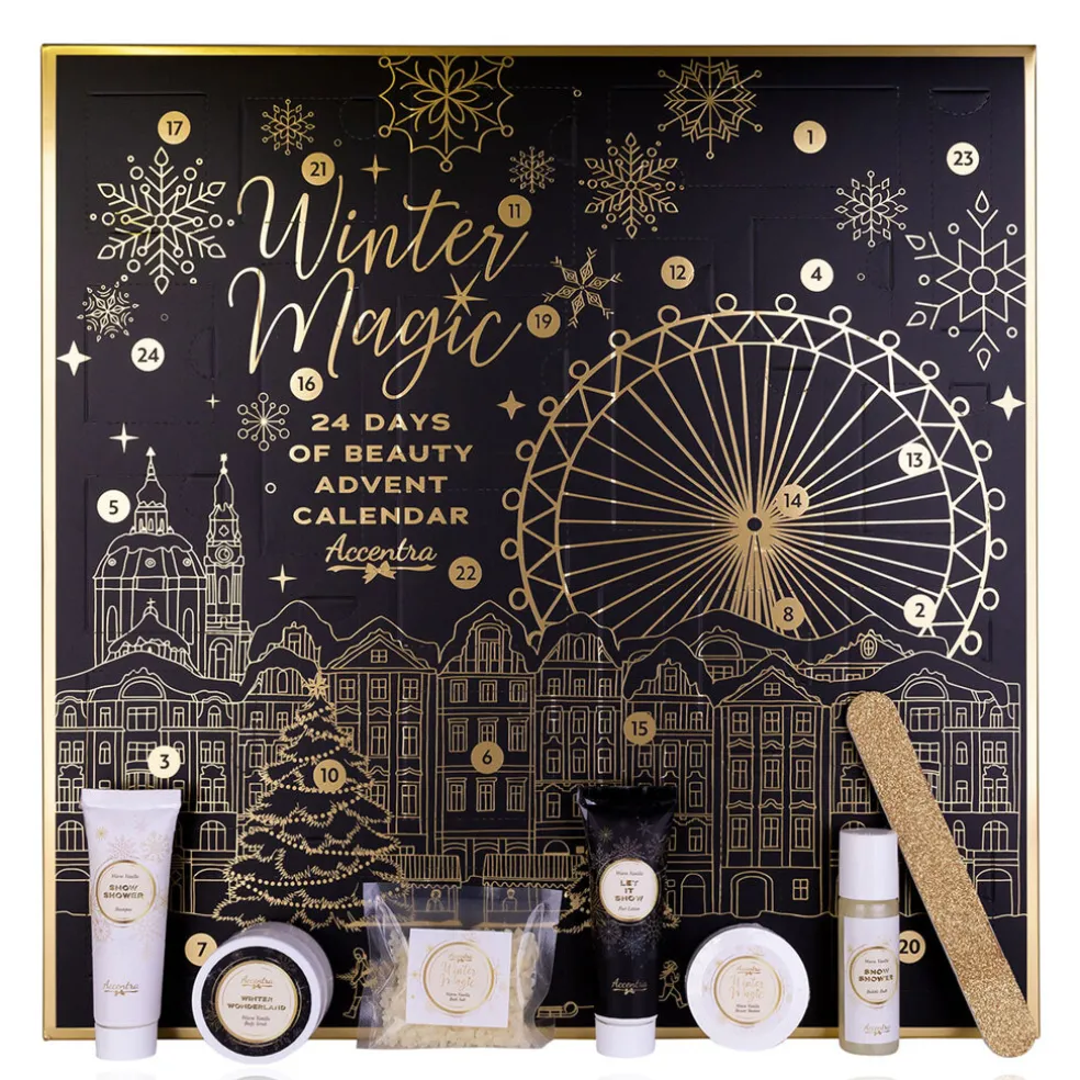 Der Accentra Winter Magic Noir Adventskalender ist ein luxuriöser Adventskalender in einer quadratischen Schachtel mit 24 eleganten Überraschungen für Pflege und Komfort im Winter. Jedes Fenster enthält pflegende Produkte wie feuchtigkeitsspendende Körperlotion, milde Seife, Körperpeeling, Hand- und Nagelcreme, reinigendes Shampoo, Badebomben oder Badesalze. Der Kalender enthält außerdem praktische Accessoires wie einen Bimsstein, eine Nagelbürste, eine Nagelfeile und einen Waschschwamm zur Vervollständigung des täglichen Rituals. Abgerundet wird das Ganze mit einer Duftkerze und Badeschaum für die ultimative Entspannung. Der Winter Magic Noir Adventskalender ist das perfekte Geschenk für alle, die jeden Wintertag mit einem Hauch von Eleganz und Pflege genießen möchten.