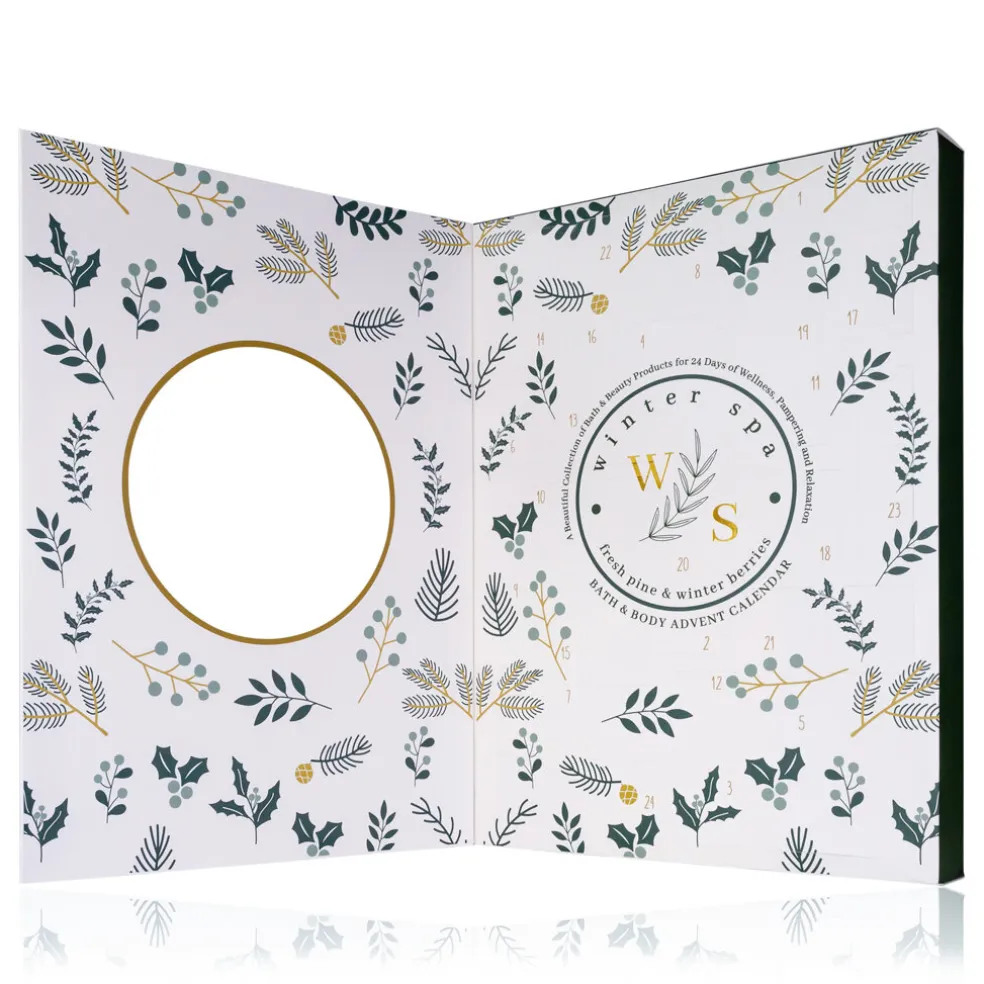 Accentra Winter Spa Fresh Pine & Winter Berries Bath & Body Advent Calendar ist ein Winterpflege-Adventskalender, inspiriert vom Duft frischer Kiefern und Winterbeeren. Dieser Kalender mit aufklappbarer Vorderseite bietet 24 Überraschungen, die jeden Tag der Adventszeit zu einem kleinen Wellness-Ritual machen. Sie finden verwöhnende Produkte wie Körperlotion, Badeschaum, Shampoo, Hand- und Nagelcreme, Körperpeeling, Kerzen und sogar einen hölzernen Massageroller, der Ihnen hilft, sich zu entspannen und zu erholen. Weitere zauberhafte Überraschungen sind Badezusätze, Badesalze, Badekaviar und getrocknete Orangen, die jedem Bad eine einzigartige Note verleihen. Der Winter Spa Adventskalender ist das perfekte Geschenk für alle, die Momente der Gemütlichkeit und den Duft des Winterwaldes lieben.